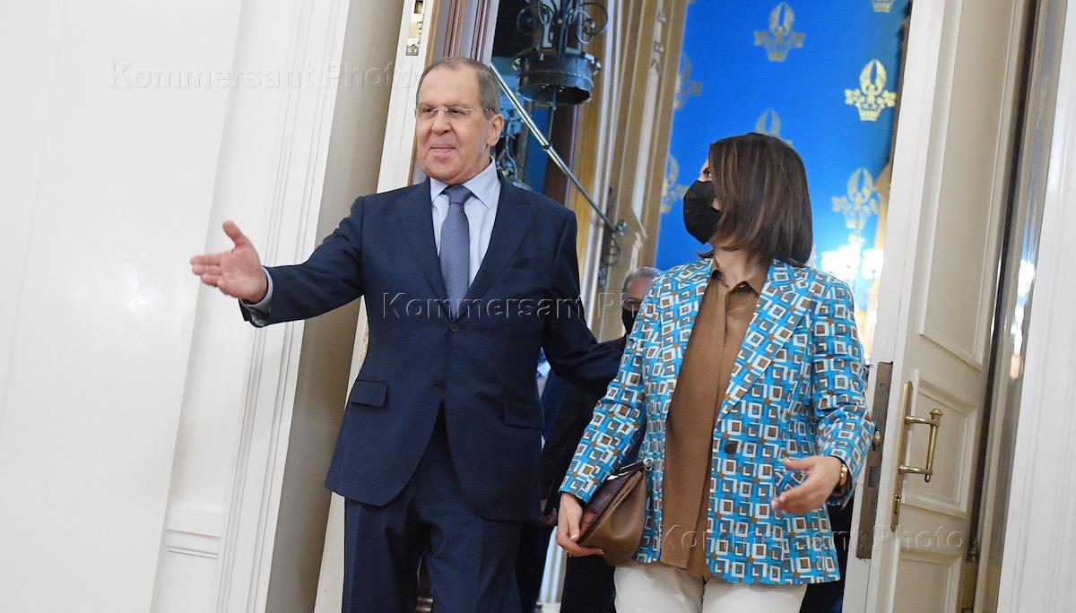 Переговоры министра иностранных дел России Сергея Лаврова с министром иностранных дел и международного сотрудничества Правительства национального единства Ливии Наджлой Манкуш в Доме приемов МИД России. Министр иностранных дел России Сергей Лавров (слева) и министр иностранных дел и международного сотрудничества Правительства национального единства Ливии Наджла Манкуш (в центре) перед началом переговоров.