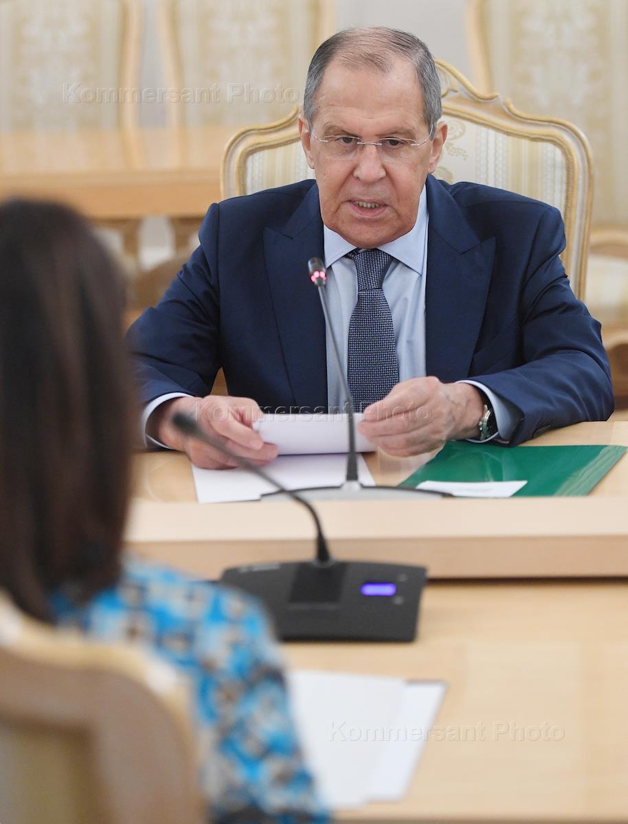Переговоры министра иностранных дел России Сергея Лаврова с министром иностранных дел и международного сотрудничества Правительства национального единства Ливии Наджлой Манкуш в Доме приемов МИД России. Министр иностранных дел России Сергей Лавров во время переговоров.