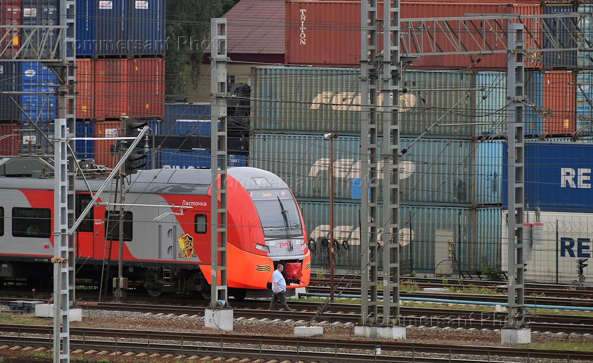 Терминально-логистический центр (ТЛЦ) "Ховрино" на станции Ховрино Октябрьской магистрали. Контейнерный терминал. Жанровая фотография.