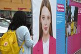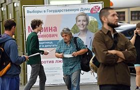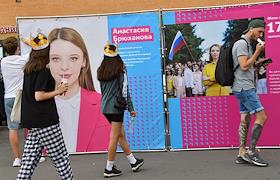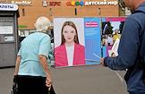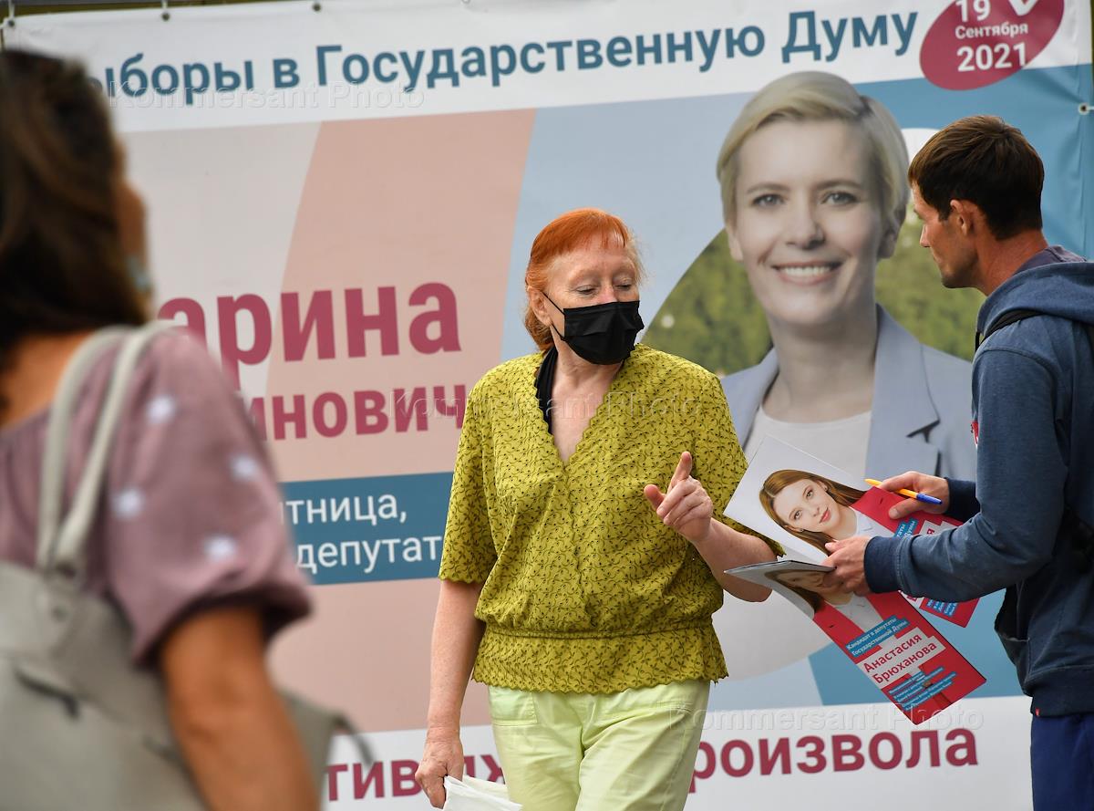 Выборы депутатов Государственной думы (ГД) России - 2021. Предвыборная агитация в Ленинградском одномандатном округе №198 возле станции метро "Тимирязевская". Жанровая фотография. Агитационный плакат кандидата в ГД России, сотрудницы фонда "Городские проекты Ильи Варламова и Максима Каца" Анны Брюхановой.