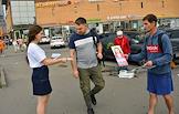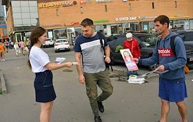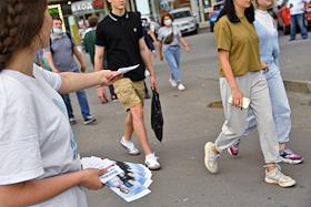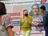 Выборы депутатов Государственной думы (ГД) России - 2021. Предвыборная агитация в Ленинградском одномандатном округе №198 возле станции метро "Тимирязевская". Жанровая фотография. Волонтеры во время раздачи агитационных буклетов.