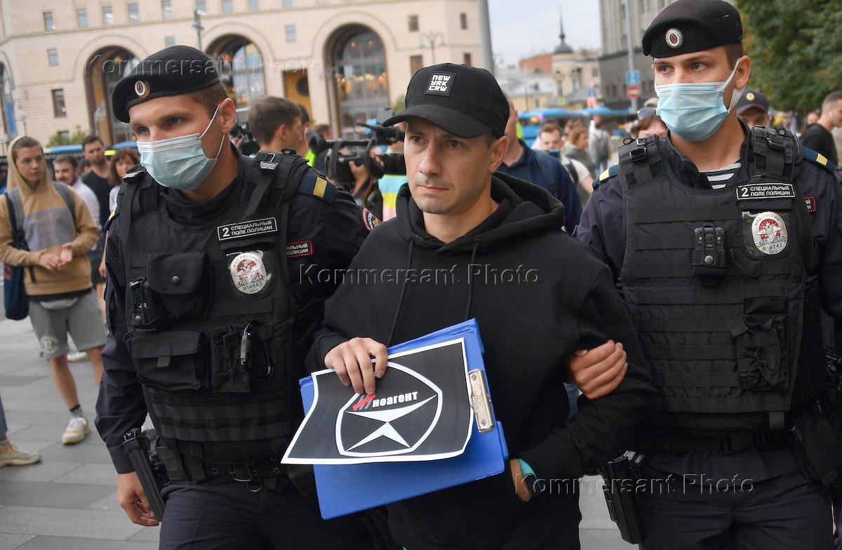 Одиночные пикеты у здания ФСБ на Лубянке в поддержку журналистов и СМИ, признанных иностранными агентами. Сотрудники полиции во время задержания участника акции.