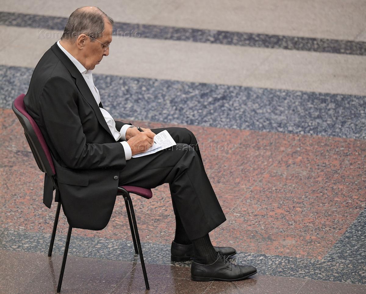 Празднование дня Государственного Флага России. Встреча президента России Владимира Путина с представителями партии "Единая Россия" на Поклонной горе. Министр иностранных дел России Сергей Лавров перед началом встречи.