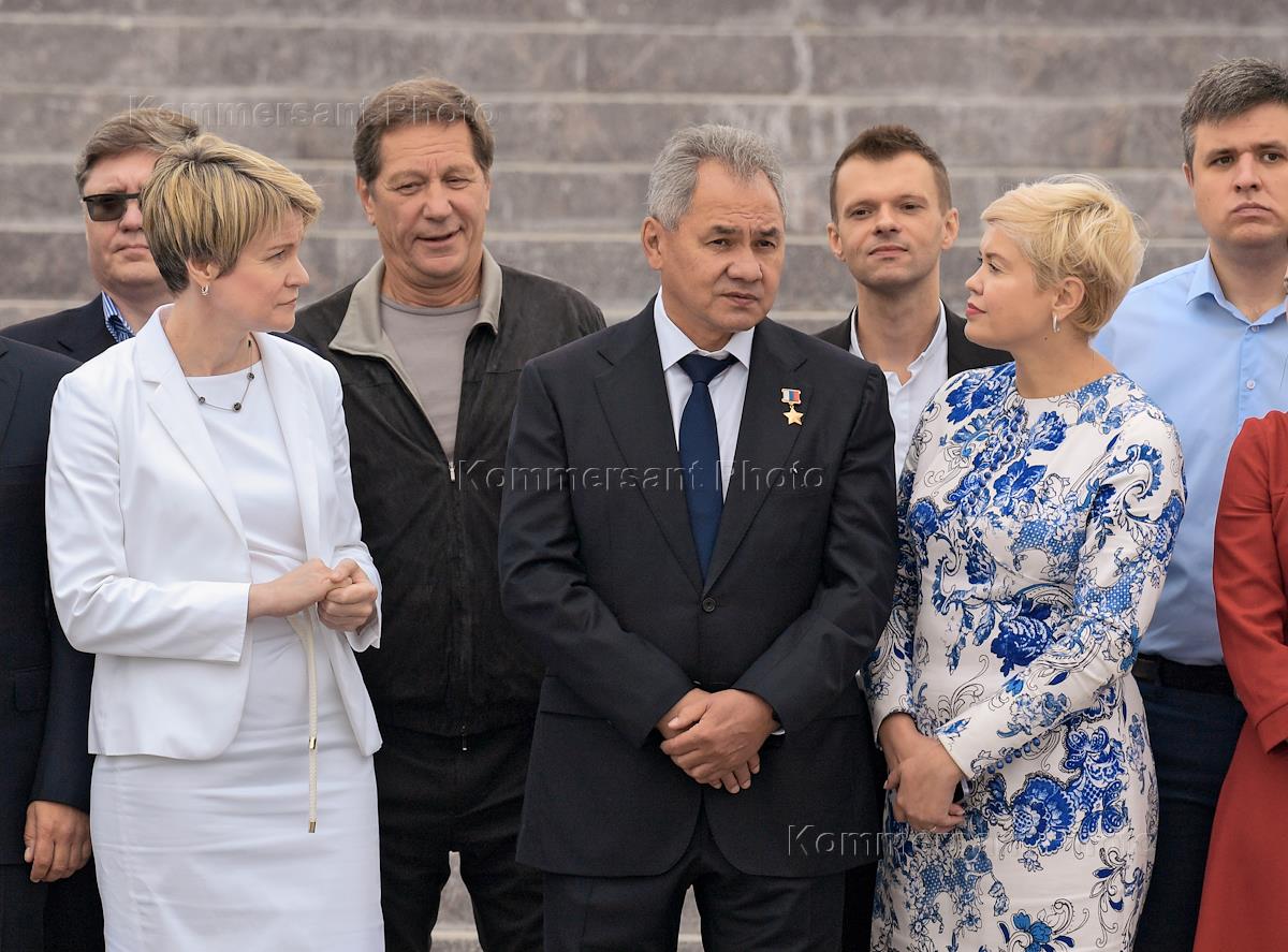 Празднование дня Государственного Флага России. Церемония поднятия флага России в Парке Победы на Поклонной горе. Слева направо: член комитета Государственной думы (ГД) России по труду, социальной политике и делам ветеранов Андрей Исаев, руководитель Фонда "Талант и успех", член Совета при президенте России по науке и образованию Елена Шмелева, первый заместитель председателя ГД России Александр Жуков, министр обороны России Сергей Шойгу, директор Российской ассоциации электронных коммуникаций (РАЭК) Сергей Плуготаренко, ректор Курской государственной сельскохозяйственной академии имени И. И. Иванова Екатерина Харченко и руководитель Московского областного регионального отделения ВОО "Молодая Гвардия Единой России" Александр Толмачев во время церемонии.