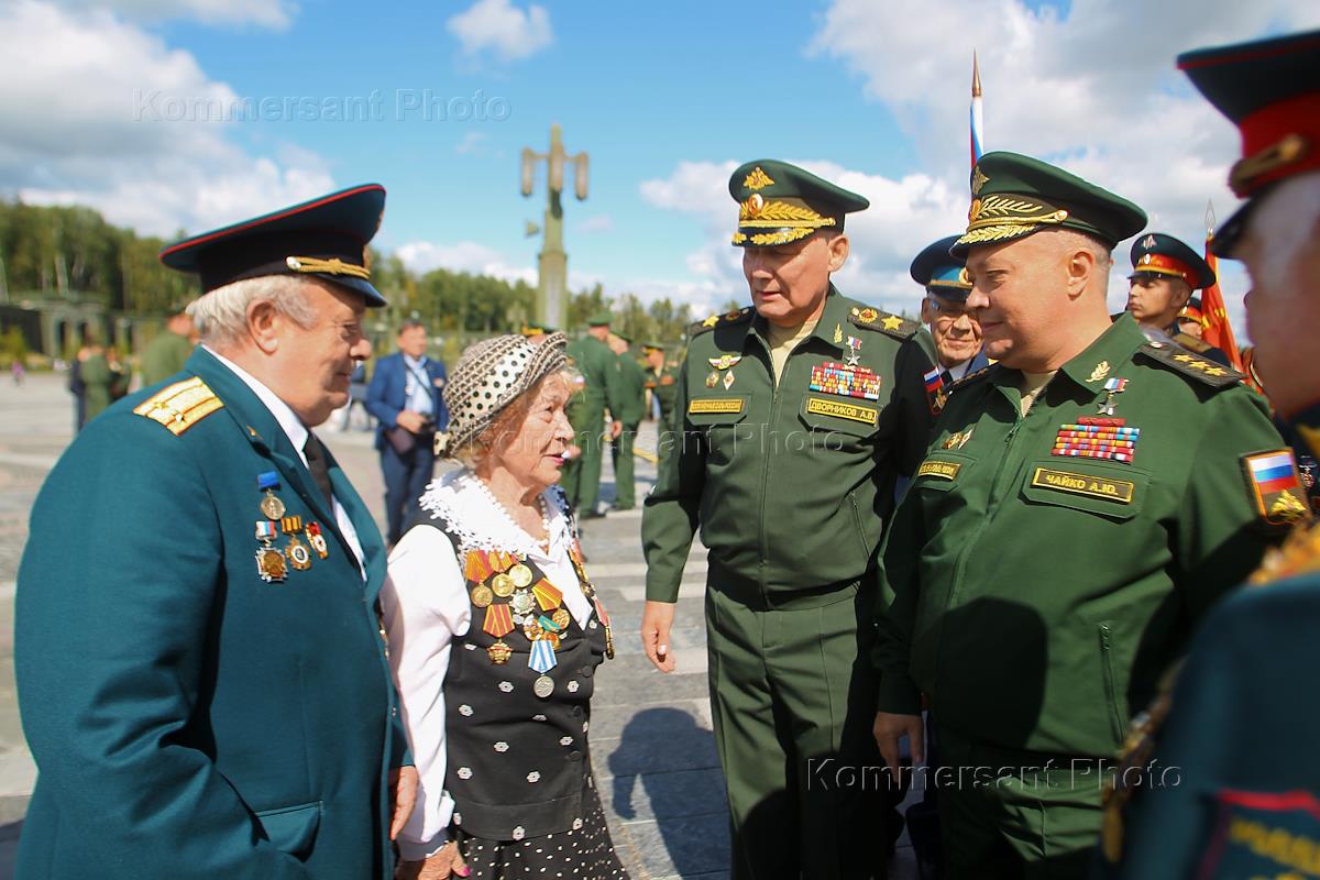 Празднование Дня государственного флага России. Церемония передачи 15 исторических боевых знамен от военнослужащих караула Московского гарнизона военнослужащим Южного военного округа прошла на Соборной площади Главного храма Вооруженных сил России в парке "Патриот". Знамена станут экспонатами музеев Южного и Северо-Кавказского федеральных округов. Жанровая фотография. Ветераны Великой отечественной войны во время церемонии.