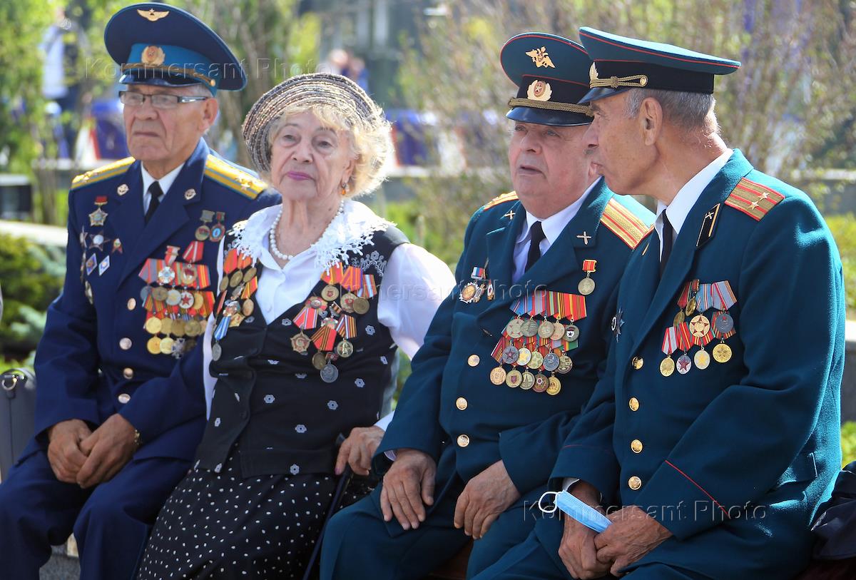 Празднование Дня государственного флага России. Церемония передачи 15 исторических боевых знамен от военнослужащих караула Московского гарнизона военнослужащим Южного военного округа прошла на Соборной площади Главного храма Вооруженных сил России в парке "Патриот". Знамена станут экспонатами музеев Южного и Северо-Кавказского федеральных округов. Жанровая фотография. Ветераны Великой отечественной войны во время церемонии.