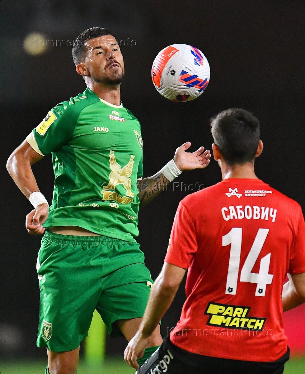 Российская Премьер-Лига (РПЛ). Тинькофф - Чемпионат России по футболу 2021/2022. 5-й тур. Матч между командами "Химки" (Химки)- "Рубин" (Казань) на стадионе "Арена Химки". Игроки команды "Рубин" Дарко Йевтич (слева) и Илья Самошников (справа) во время матча.