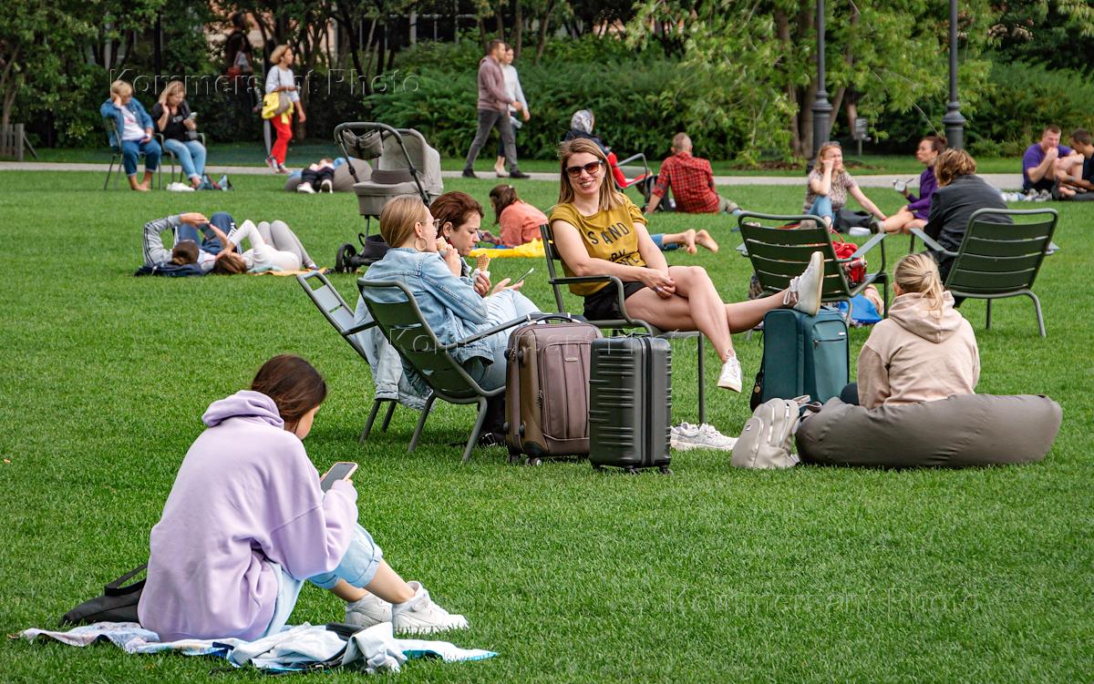 Виды Санкт-Петербурга. Отдыхающие на острове Новая Голландия в Парке культуры и отдыха. Девушки с чемоданами на газоне.