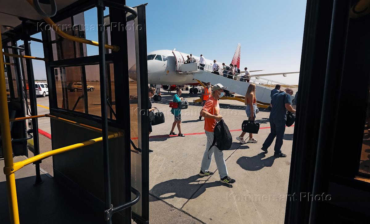 Международный аэропорт Волгограда. Жанровая фотография. Пассажиры во время выхода из самолет.