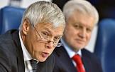 Всероссийская пресс-конференция партии "Справедливая Россия – За Правду", посвященная инициативе о введении Справедливого базового дохода, в информационном агентстве ТАСС. Первый заместитель председателя комитета Государственной думы (ГД) России по экономической политике, промышленности, инновационному развитию и предпринимательству Валерий Гартунг (слева) и председатель партии "Справедливая Россия – Патриоты - За Правду", руководитель фракции "Справедливая Россия" в ГД России Сергей Миронов (справа) во время пресс-конференции.