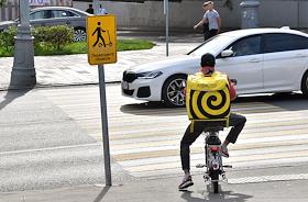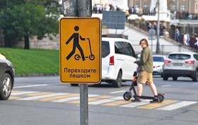 Жанровая фотография. Дорожный знак для водителей самокатов "Переходите пешком" у пешеходного перехода.
