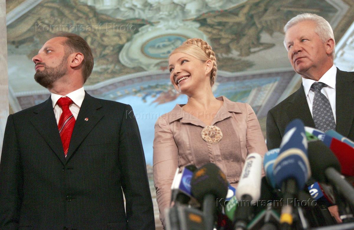 Народный депутат Украины, лидер фракции "Наша Украина" (НУ) Роман Бессмертный (слева), народный депутат Украины, лидер Блока Юлии Тимошенко (БЮТ) Юлия Тимошенко (в центре) и народный депутат Украины, лидер Социалистической партии Украины (СПУ) Александр Мороз (справа) во время пресс-конференции.