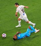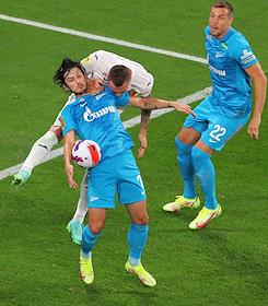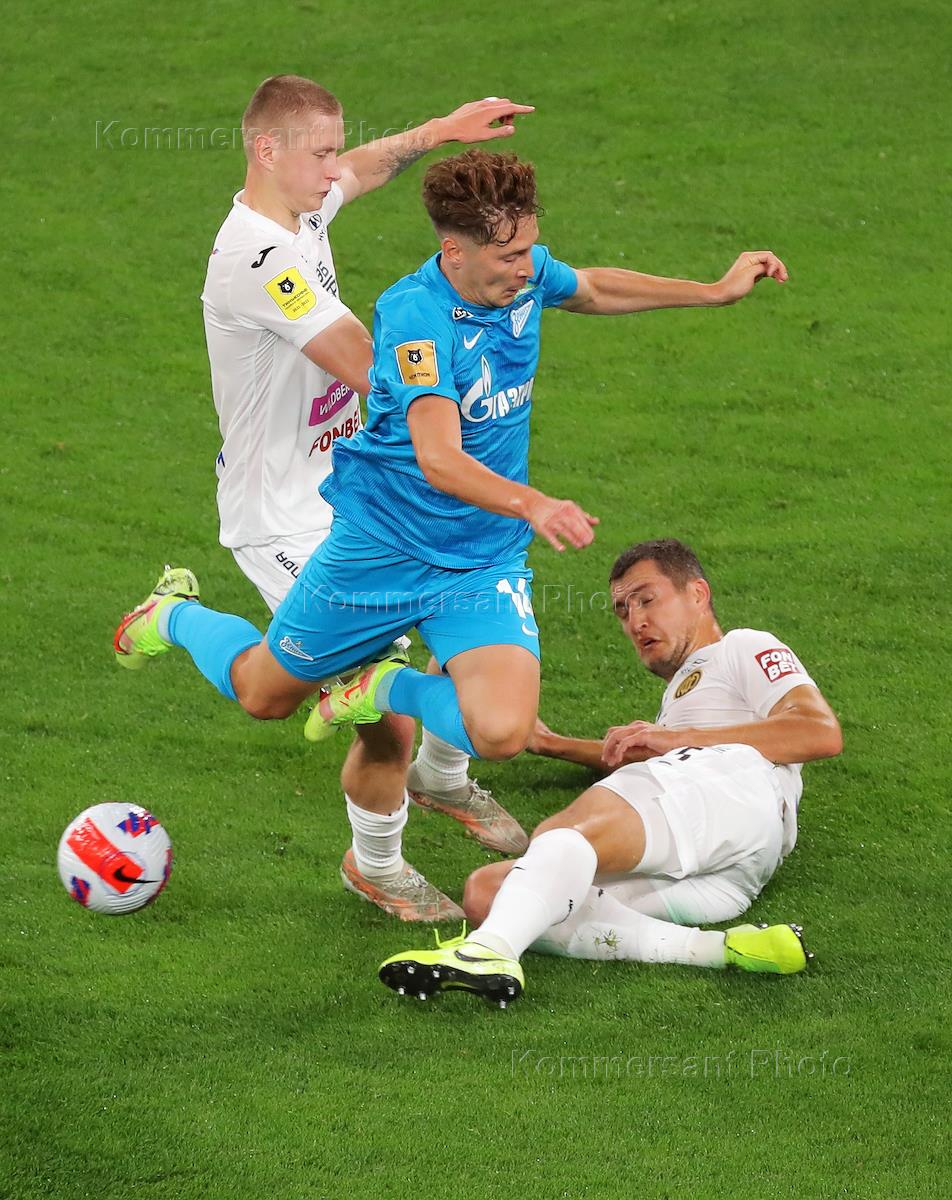 Российская Премьер-Лига (РПЛ). Тинькофф - Чемпионат России по футболу 2021/2022. 6-й тур. Матч между командами ЦСКА (Москва) - "Зенит" (Санкт-Петербург) стадионе "Газпром Арена". Игрок команды ЦСКА Алан Дзагоев (в центре) и игрок команды "Зенит" Малькольм (слева) во время матча.