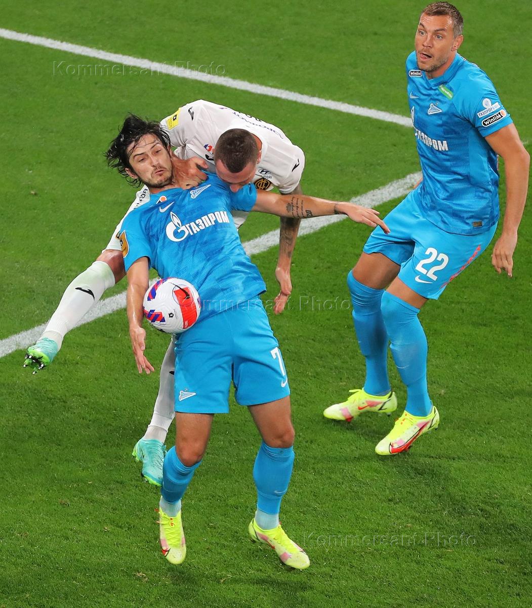 Российская Премьер-Лига (РПЛ). Тинькофф - Чемпионат России по футболу 2021/2022. 6-й тур. Матч между командами ЦСКА (Москва) - "Зенит" (Санкт-Петербург) стадионе "Газпром Арена". Игрок команды ЦСКА Алан Дзагоев (в центре) и игрок команды "Зенит" Малькольм (слева) во время матча.