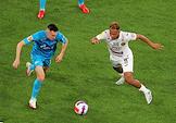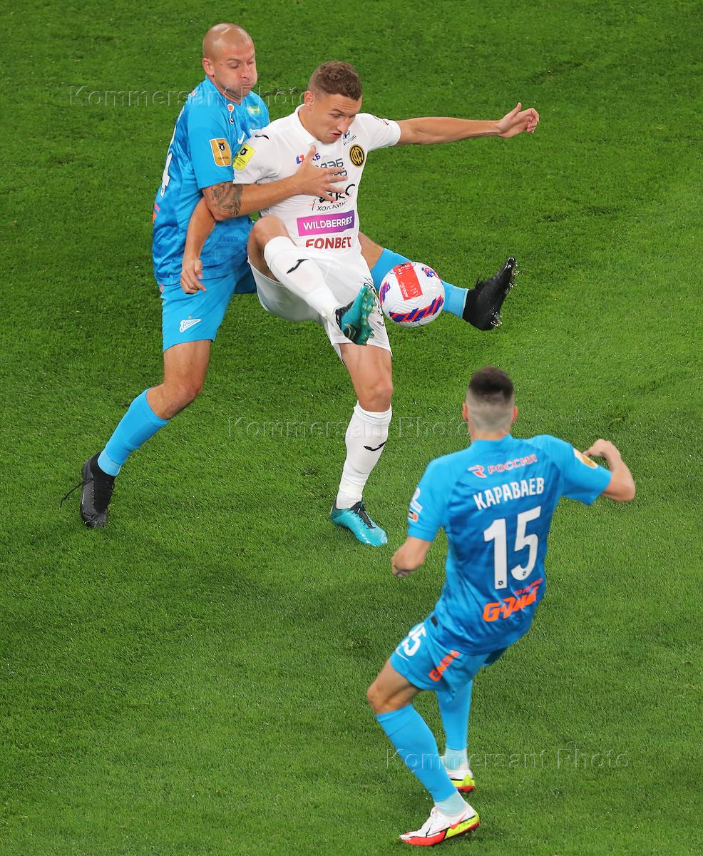 Российская Премьер-Лига (РПЛ). Тинькофф - Чемпионат России по футболу 2021/2022. 6-й тур. Матч между командами ЦСКА (Москва) - "Зенит" (Санкт-Петербург) стадионе "Газпром Арена". Игрок команды ЦСКА Алан Дзагоев (в центре) и игрок команды "Зенит" Малькольм (слева) во время матча.