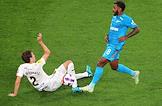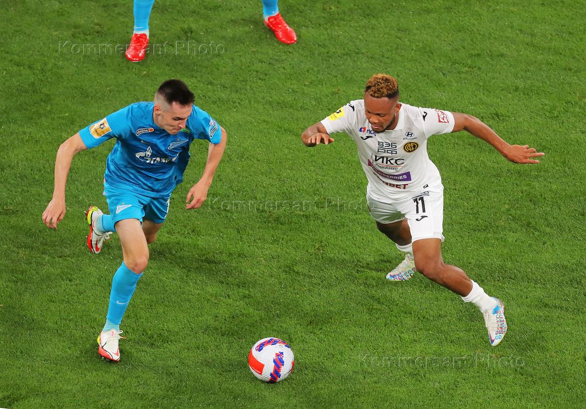Российская Премьер-Лига (РПЛ). Тинькофф - Чемпионат России по футболу 2021/2022. 6-й тур. Матч между командами ЦСКА (Москва) - "Зенит" (Санкт-Петербург) стадионе "Газпром Арена". Игрок команды ЦСКА Марио Фернандес (слева) и игрок команды "Зенит" Вендел (справа) во время матча.