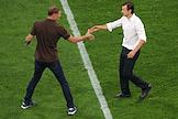 Российская Премьер-Лига (РПЛ). Тинькофф - Чемпионат России по футболу 2021/2022. 6-й тур. Матч между командами ЦСКА (Москва) - "Зенит" (Санкт-Петербург) стадионе "Газпром Арена". Главный тренер команды "Зенит" Сергей Семак (справа) и главный тренер команды ЦСКА Алексей Березуцкий (слева) во время матча.