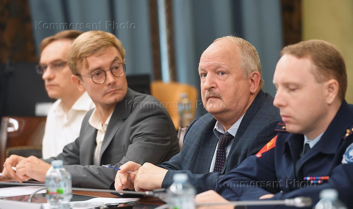 Общественные слушания "Духовная безопасность в общественном и религиозном измерении" в Общественной палате России. Кандидат политических наук, доцент, заведующий Центром изучения новых вызовов и угроз ИАМП Дипломатической академии МИД России Антон Варфоломеев (второй слева) и гендиректор Института интеллектуальных технологий Виктор Ананьев (второй справа) во время слушаний.