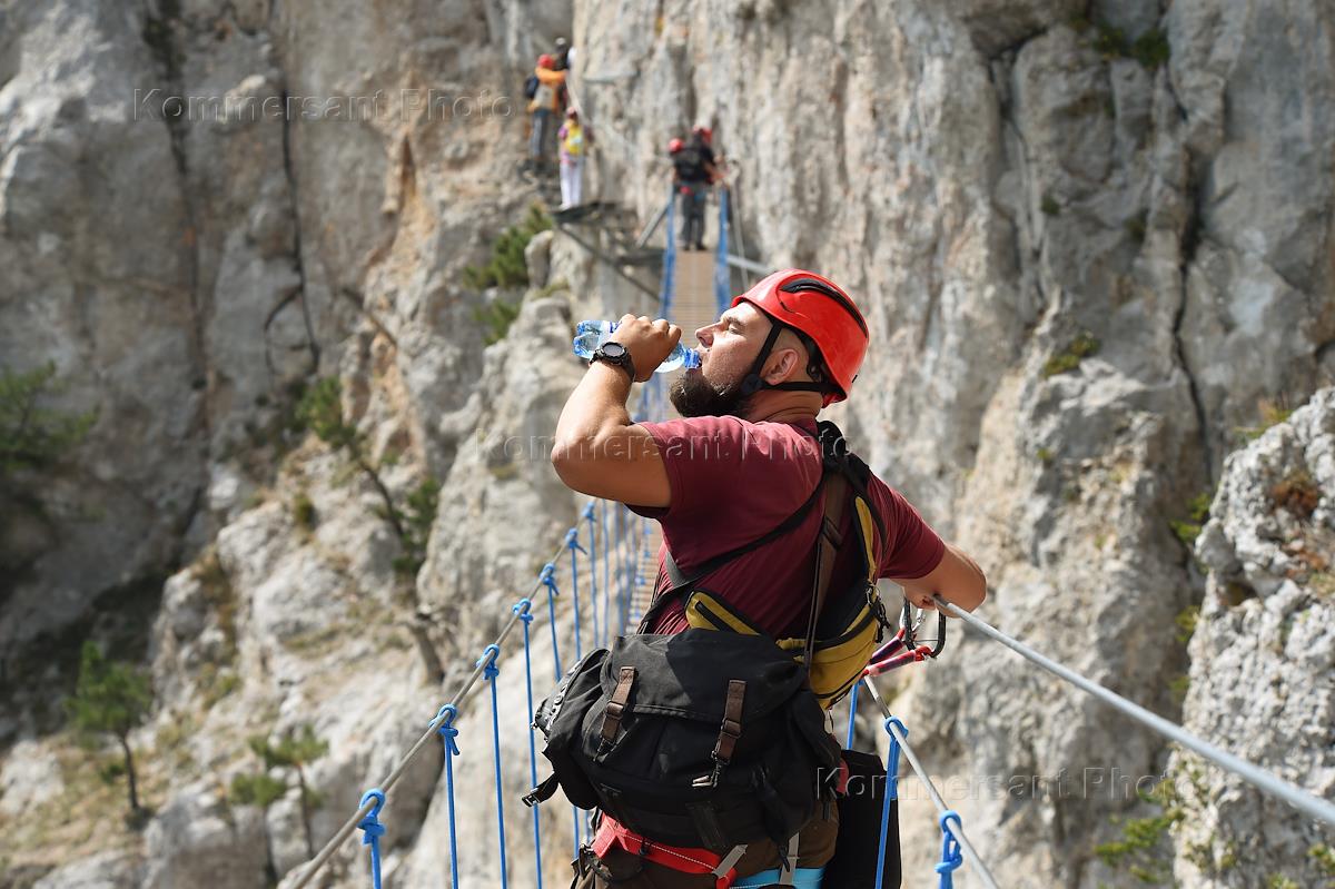 Виды Крыма. Жанровая фотография. Туристы на вершине Ай-Петри. Экстремальный маршрут "Небесная тропа" на Ай-Петри.