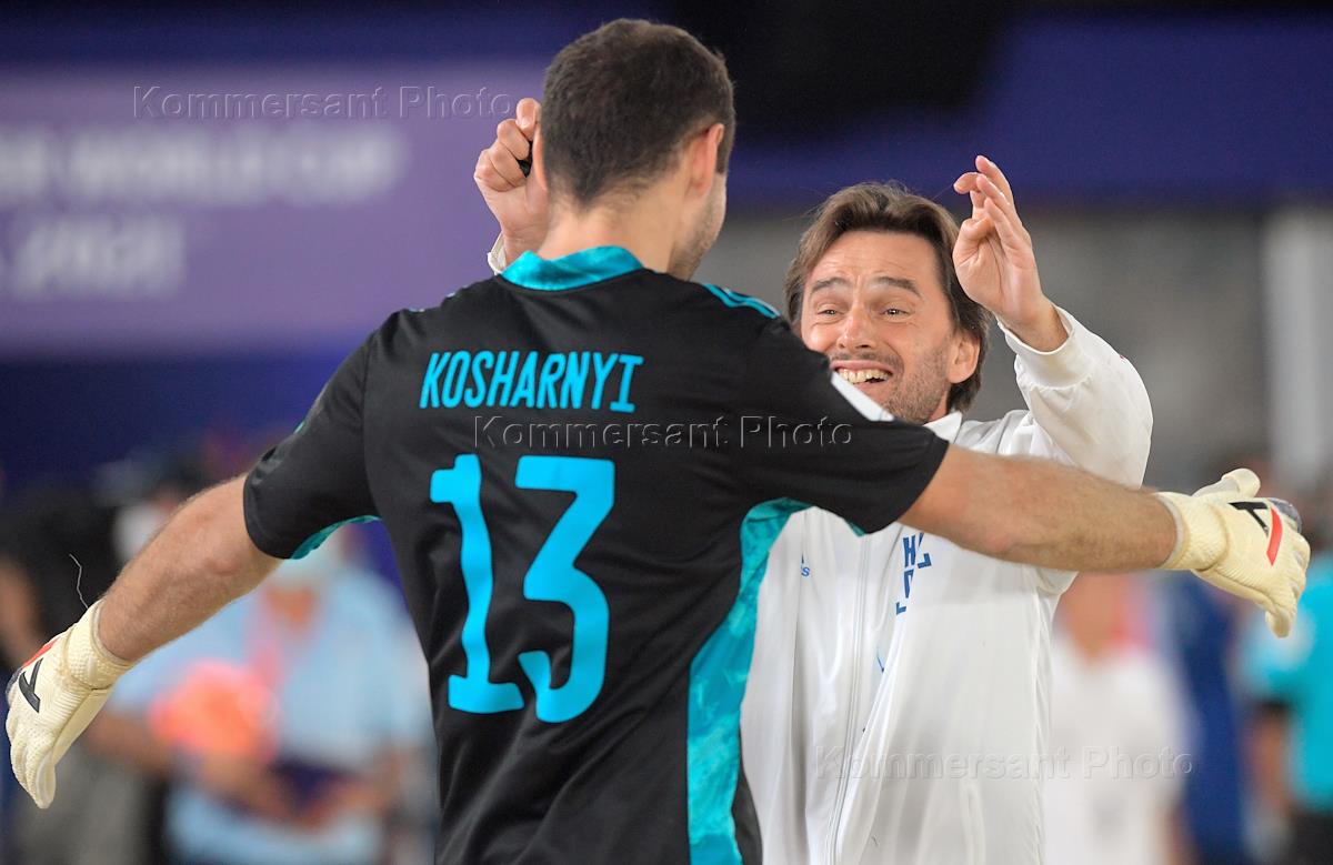 Чемпионат мира по пляжному футболу 2021. Финал. Матч между сборными России (РФС) и Японии на Большой арене спортивного комплекса "Лужники". Главный тренер сборной России (РФС) Михаил Лихачев (справа) и вратарь сборной России (РФС) Станислав Кошарный (слева) после матча.