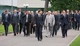 Заместитель председателя Комитета Государственной Думы России по международным делам Александр Карелин (в центре) и депутаты фракции "Единая Россия" Государственной Думы России перед встречей с Президентом России Владимиром Путиным. Встреча прошла в подмосковном пансионате "Лесные дали".
