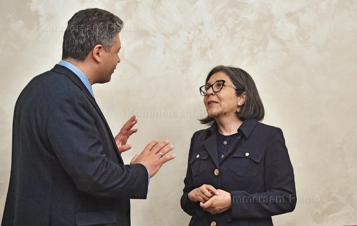 Заседание "круглого стола" на тему: "Противодействие внешнему вмешательству в выборы" в Общественной палате России. Временный поверенный в делах посольства Боливии в России Мария Луиза Рамос Урсагасте (справа) и руководитель Координационного совета Общественной палаты России по контролю за голосованием Максим Григорьев (слева) во время заседания.