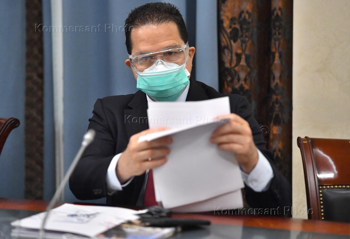 Заседание "круглого стола" на тему: "Противодействие внешнему вмешательству в выборы" в Общественной палате России. Председатель комитета Государственной думы России по безопасности и противодействию коррупции Василий Пискарев перед началом заседания.