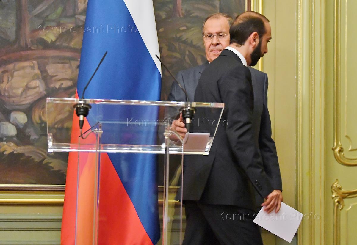 Министр иностранных дел Республики Армения Арарат Мирзоян (справа) и министр иностранных дел России Сергей Лавров (слева) после окончания пресс-конференции по итогам переговоров в Доме приемов МИД России.