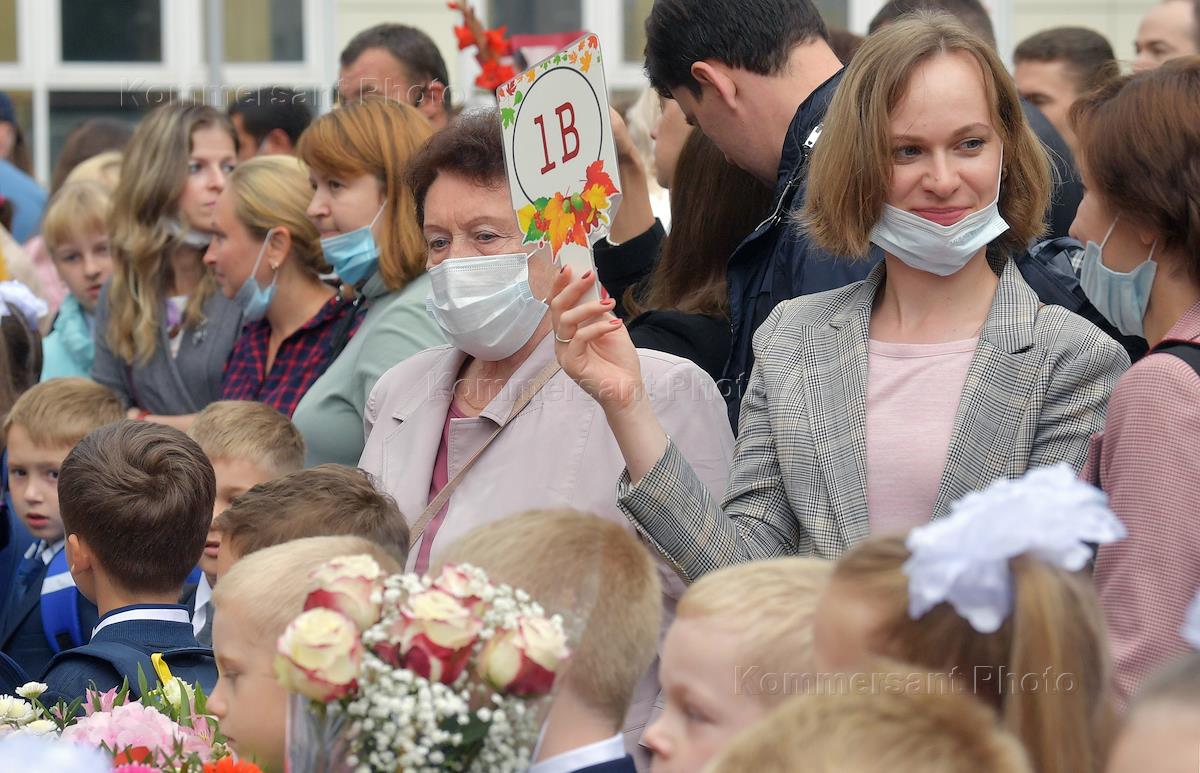 Праздник "День знаний", посвященный началу нового учебного года в МБОУ "Гимназия №16" города Мытищи. Измерение температуры учащимся перед началом занятий.