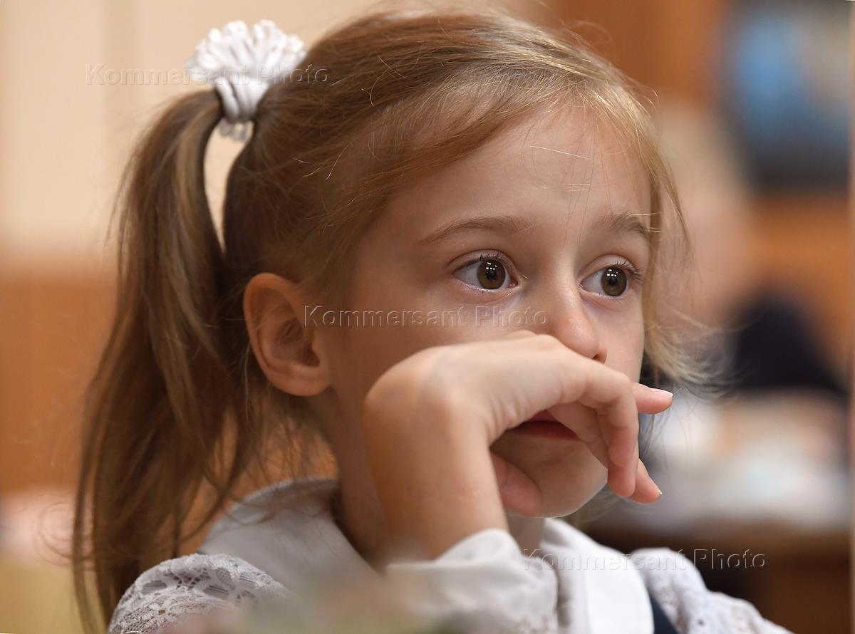 Рабочий визит председателя ЦК КПРФ, руководителя фракции КПРФ в Государственной Думе России Геннадия Зюганова в Подольск. Праздник "День знаний" в гимназии имени Подольских курсантов. Урок в классе гимназии. ЭЖанровая фотография. Ученица на уроке.