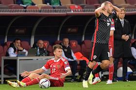 Отборочный матч Чемпионата мира-2022 по футболу между национальными сборными России и Хорватии на Большой спортивной арене Олимпийского комплекса "Лужники". Игрок сборной команды России Александр Головин (слева) во время матча.