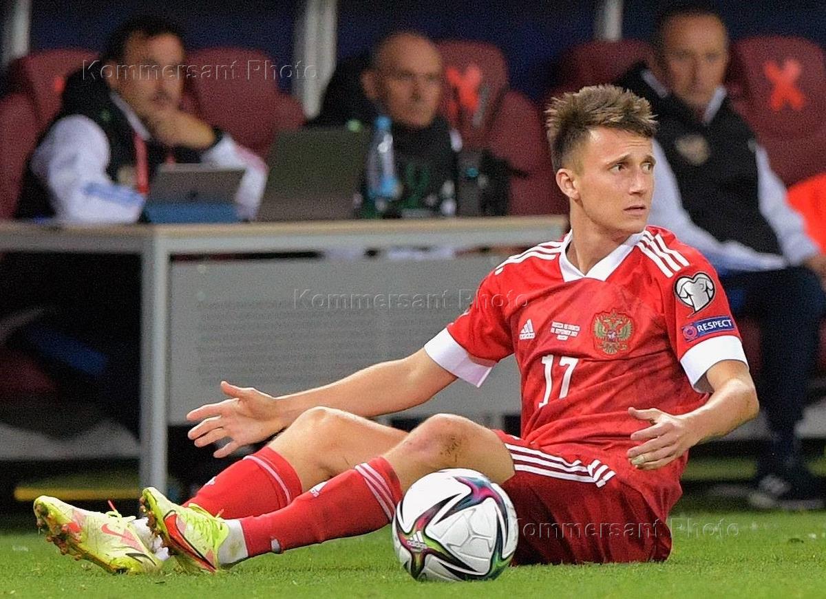 Отборочный матч Чемпионата мира-2022 по футболу между национальными сборными России и Хорватии на Большой спортивной арене Олимпийского комплекса "Лужники". Игрок сборной команды России Александр Головин во время матча