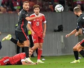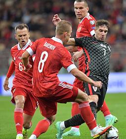 Отборочный матч Чемпионата мира-2022 по футболу между национальными сборными России и Хорватии на Большой спортивной арене Олимпийского комплекса "Лужники". Игрок сборной команды России Игорь Дивеев (справа) во время матча.