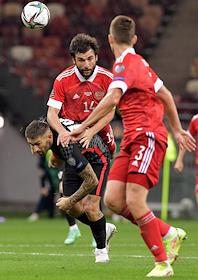 Отборочный матч Чемпионата мира-2022 по футболу между национальными сборными России и Хорватии на Большой спортивной арене Олимпийского комплекса "Лужники". Игрок сборной команды России Георгий Джикия (в центре) во время матча.