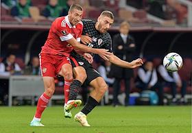 Отборочный матч Чемпионата мира-2022 по футболу между национальными сборными России и Хорватии на Большой спортивной арене Олимпийского комплекса "Лужники". Игрок сборной команды России Далер Кузяев (слева) во время матча.