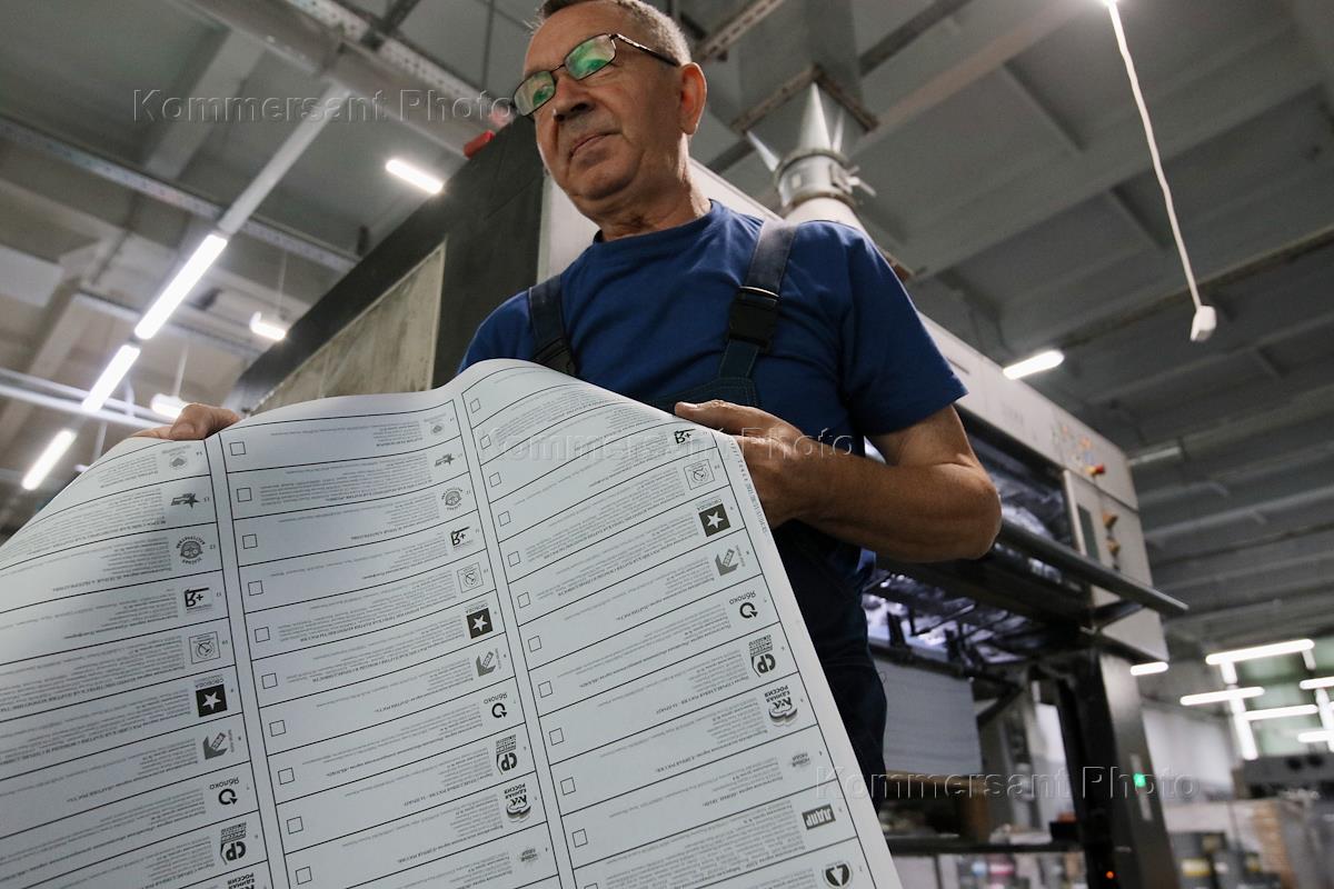 Подготовка к Единому дню голосования. Жанровая фотография. Печать избирательных бюллетеней для голосования на выборах депутатов Государственной думы России восьмого созыва в издательстве "Идел-Пресс".