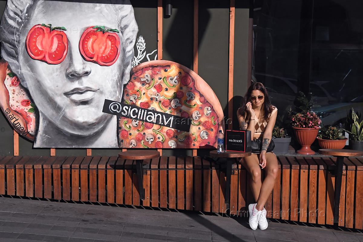 Жанровая фотография. Девушка разговаривает по мобильному телефону у витрины ресторана.
