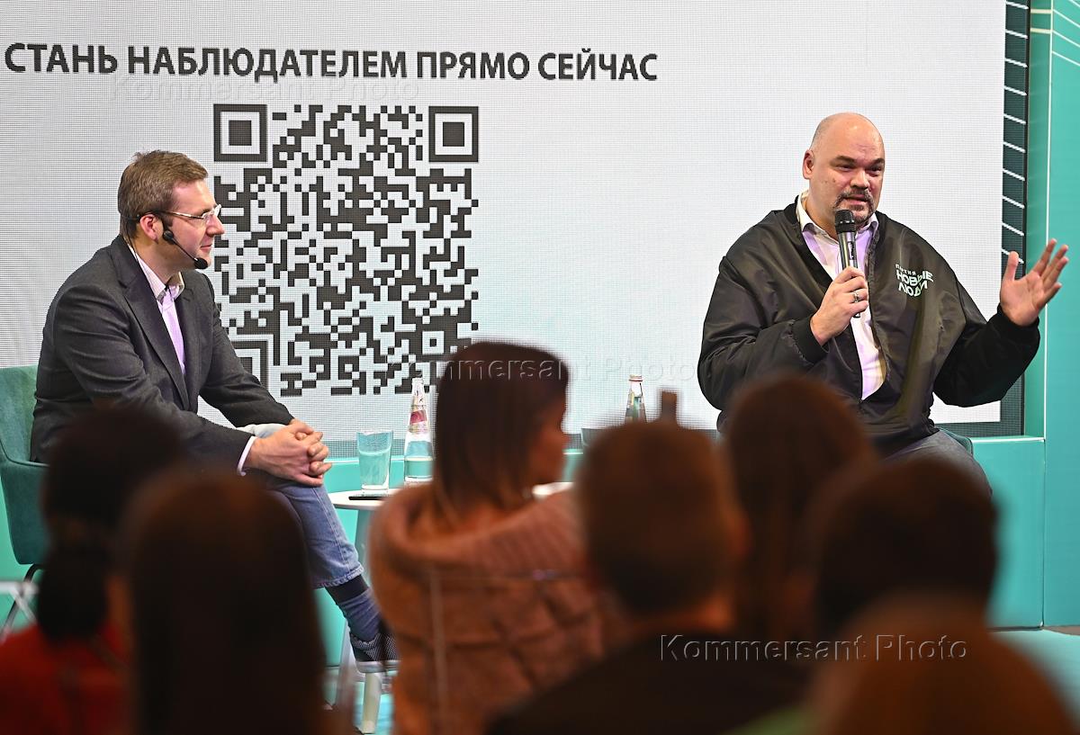 Всероссийский форум наблюдателей партии "Новые люди" в Доме культуры "Рассвет". Президент Центра развития региональной политики Илья Гращенков (слева) и член центральной избирательной комиссии от партии "Новые люди" Даниил Коган (справа) во время заседания форума.