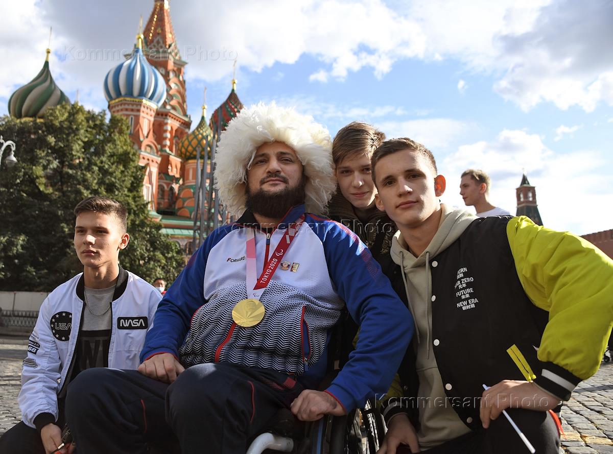 Церемония чествования российских спортсменов после XVI Паралимпийских игр в Токио на Красной площади. Российский спортсмен Муса Таймазов (в центре) на церемонии.