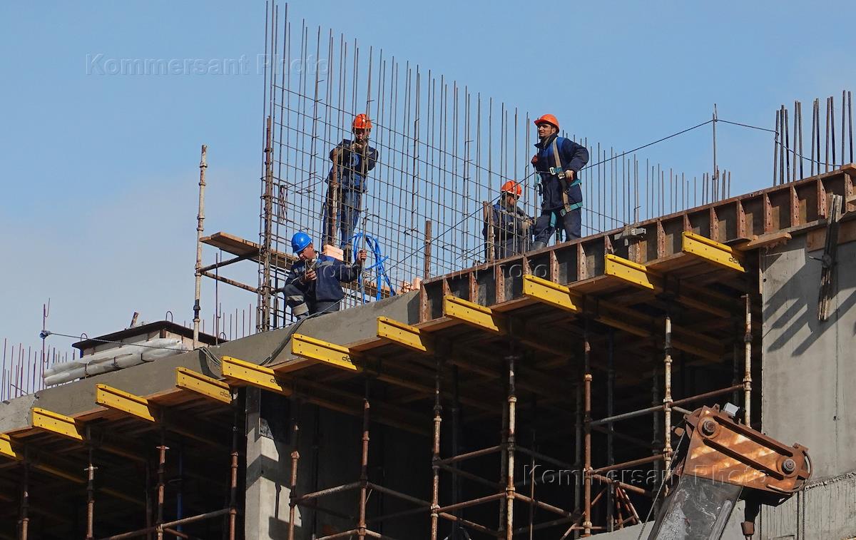 Виды Москвы. Жанровая фотография. Строители монтируют арматуру во время строительства здания.