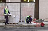 Виды Москвы. Жанровая фотография. Рабочие и дорожно-строительная техника во время укладки плитки на тротуаре.