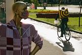 Виды Москвы. Жанровая фотография. Манекен на крыльце магазина женской одежды и курьер службы доставки "Яндекс. Еда" на велосипеде.