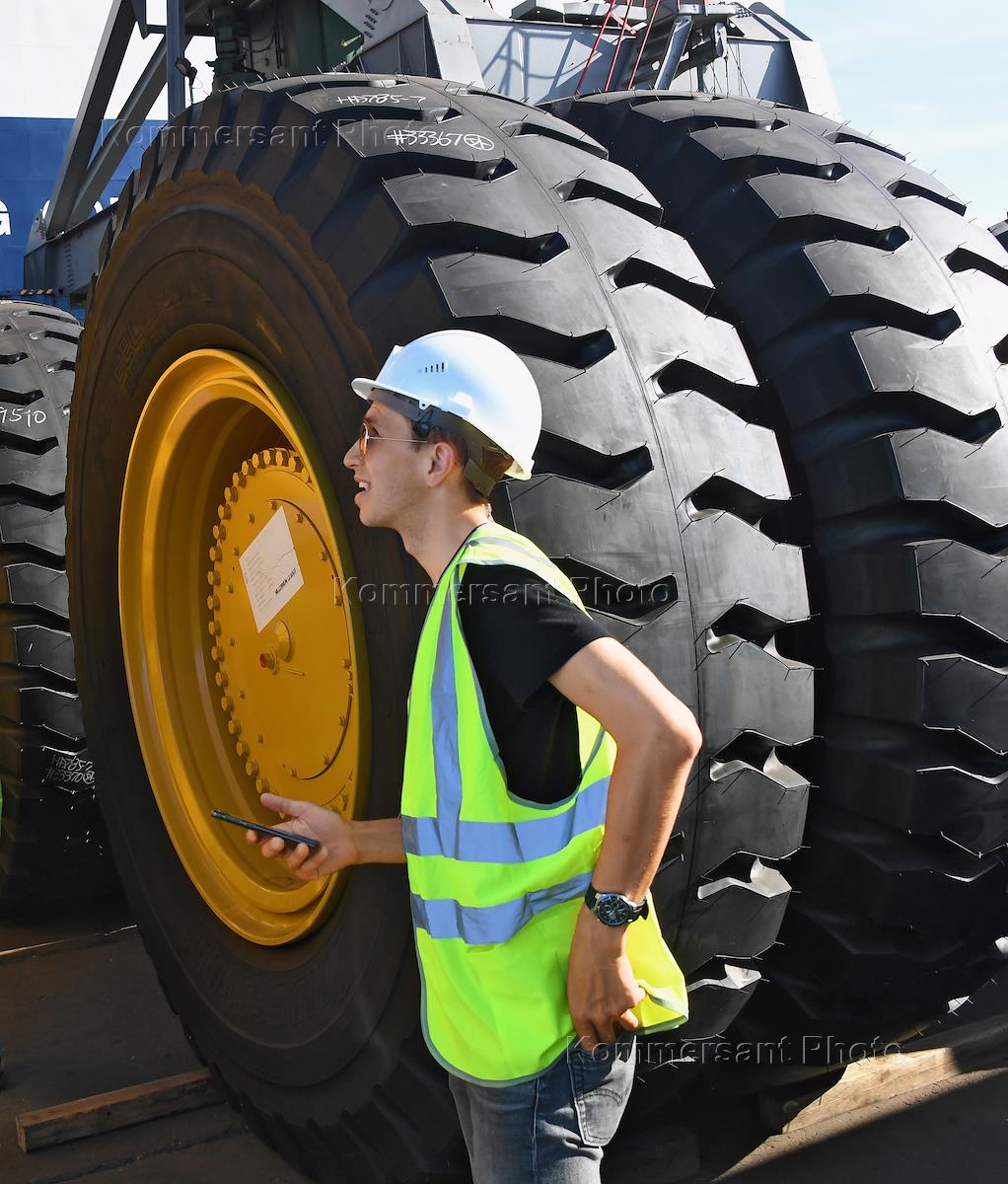 Виды Владивостока. Жанровая фотография. Рабочий на фоне колеса во время ппогрузочных работ во Владивостокском морском торговом порту.
