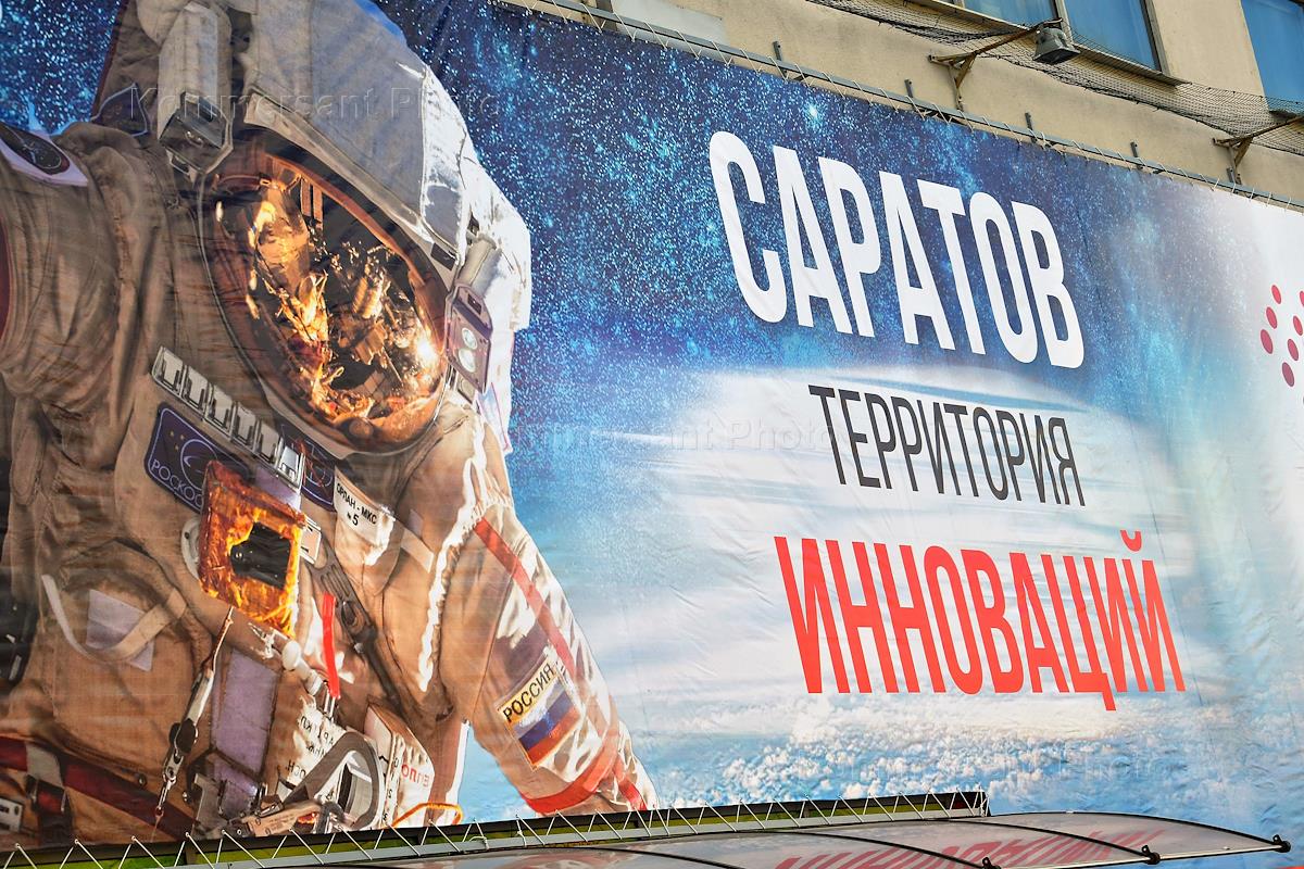 Виды Саратова. Жанровая фотография. Предвыборный агитационный плакат политической партии "Единая Россия" на улице города.
