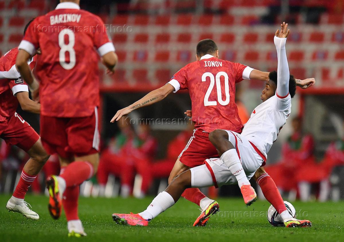 Отборочный матч Чемпионата мира-2022 по футболу между национальными сборными России и Мальты на стадионе "Открытие Арена". Игрок сборной России Игорь Дивеев (слева) во время матча.