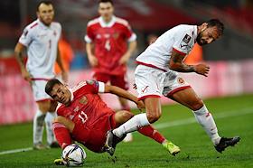 Отборочный матч Чемпионата мира-2022 по футболу между национальными сборными России и Мальты на стадионе "Открытие Арена". Игрок сборной Мальты Тристан Каруана (справа) во время матча.