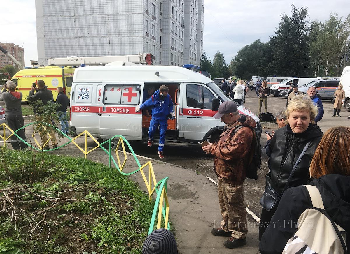 Взрыв бытового газа в жилом доме 9а по улице "28 июня". Сотрудники МЧС, полиции и автомобиль "Скорой помощи" на месте происшествия.