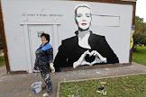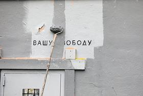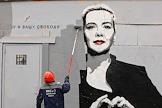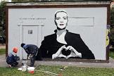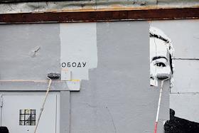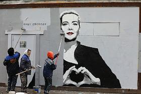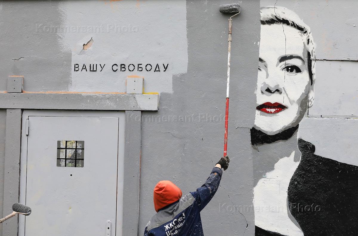 Виды Санкт Петербурга. Жанровая фотография. Сотрудники коммунальных служб закрашивают граффити - портрет члена Координационного совета (КС) оппозиции Белоруссии Марии Колесниковой на стене в Некрасовском саду.