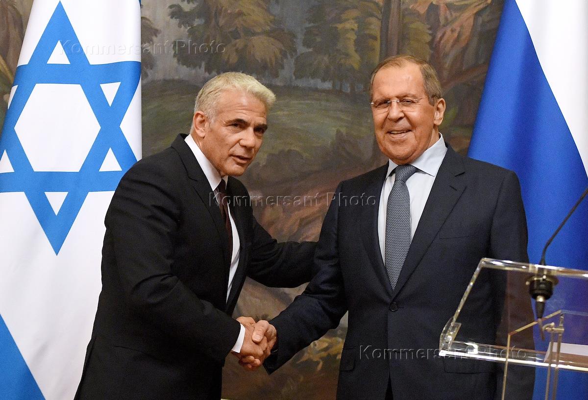 Министр иностранных дел России Сергей Лавров (справа) и министр иностранных дел Израиля Яир Лапид (слева) перед началом пресс-конференции по итогам переговоров в Доме приемов МИД России.