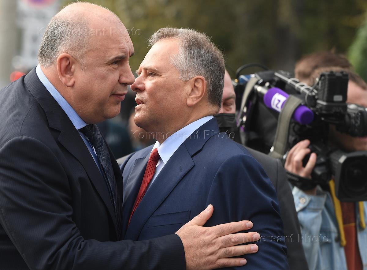 Церемония прощания с министром МЧС России Героем России, генералом армии Евгением Зиничевым в здании "Национального центра управления в кризисных ситуациях России". Советник президента России Владимир Васильев (слева) и губернатор Тверской области Игорь Руденя (справа) перед началом церемонии.